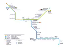 The Supertram network now consists of 50 stations across four colour-coded lines, the Blue, Purple, Yellow and Tram-Train (Black) routes, which connect with local and national bus and rail services and six park and ride sites.[3]