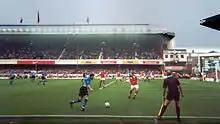 On 15 April 1989 at an FA Cup semi-final between Liverpool and Nottingham Forest, 96 Liverpool fans were crushed to death after the terraces at the Leppings Lane end of the ground became overcrowded, in what became known as the Hillsborough disaster. The following report concluded that the root cause of the disaster was the failure of local police to adequately manage the crowds.[49][50] A memorial to the victims of the disaster stands outside Hillsborough's South Stand, near the main entrance on Parkside Road. After many years of dispute about the facts, in June 2017 six men responsible for safety were charged with criminal offences including manslaughter and misconduct in public office.[51]