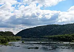 The Shenandoah River /ˌʃɛnənˈdoʊə/ is a tributary of the Potomac River, 55.6 miles (89.5 km) long with two forks approximately 100 miles (160 km) long each,[3] in the U.S. states of Virginia and West Virginia. The principal tributary of the Potomac, the river and its tributaries drain the central and lower Shenandoah Valley and the Page Valley in the Appalachians on the west side of the Blue Ridge Mountains, in northwestern Virginia and the Eastern Panhandle of West Virginia.[1]