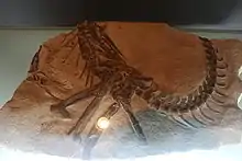 The holotype (NGMC 97-4-002, National Geological Museum of China) was collected from near the bottom (fluvial beds) of the Yixian Formation (Aptian) at the Sihetun fossil site, Beipiao, western Liaoning Province. This specimen consists of a partial skeleton preserved on a sandstone slab in a "death pose," its head above the torso. The distal parts of the hindlimbs, distal portion of the tail, and the forelimbs (except for part of the right hand) and the pectoral girdle are missing. The head is crushed, exposing the left side obliquely.