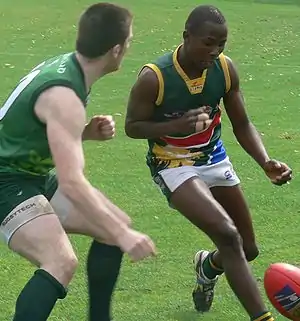 - American footballers face the opponent they are blocking, while the Australian footballer is most frequently standing in front of and facing away from their opponent when being shepherded