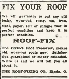 His failure in Cleveland did not delay him for long, however, because in September 1907, the Andersons moved to Elyria, Ohio, a town of approximately ten thousand residents, where he rented a warehouse within sight of the railroad and began a mail-order business selling (at a markup of 500%) a preservative paint called "Roof-Fix."[54] The first years in Elyria went very well for Anderson and his family; two more children were added for a total of three in addition to a busy social life for their parents.[55] So well, in fact, did the Anderson Manufacturing Co. do that Anderson was able to purchase and absorb several similar businesses and expand his firm's product-lines under the name Anderson Paint Company.[56] Carrying on that momentum, in late 1911 Anderson secured the financial backing to merge his companies into the American Merchants Company, a profit-sharing/investment firm operating in part on a scheme he developed around that time called "Commercial Democracy."[57][58]