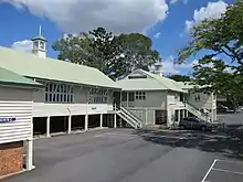 Like many Queensland state schools, Sherwood was affected by the outbreak of World War II (WWII). Due to fears of a Japanese invasion, the Queensland Government closed all coastal state schools in January 1942, and although most schools reopened on 2 March 1942, student attendance was optional until the war ended. The closed schools were sometimes occupied for defence purposes, and some schools remained closed "for special reasons" after the rest had reopened.[89][90][91] Slit trenches, to protect students from Japanese air raids, were also dug at Queensland state schools, often by parents and staff. At Sherwood State School trenches were dug to the northeast of the tennis courts (near the location of the current Administration Block G). A First Aid and Ambulance Post was also established under the school building - at first sand bagged but later bricked in (under Block C).[92][93][94][1]
