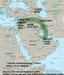The Shia Crescent (or Shiite Crescent) is the notionally crescent-shaped region of the Middle East where the majority population is Shia or where there is a strong Shia minority in the population. In recent years the term has come to identify areas under Iranian influence or control, as Iran has sought to unite all Shia Muslims under one banner. Areas included in the Shia Crescent include Lebanon, Syria, Bahrain, Iraq, Iran, Azerbaijan, Yemen, and western Afghanistan.[1]