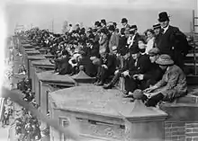 At the park's beginning, homeowners on both Somerset Street and 20th Street had a great view of the proceedings within, thanks to the low outfield fences. While this changed for the people on Somerset in 1913 when Shibe added the left field bleacher section and blocked the view from that direction,[31] it was still a clear shot in from 20th Street over the low, 12-foot (3.7 m) wall in right. The view from the roofs, the bedroom bay windows, and even the porch roofs on 20th was as good as from some of the seats inside the park: Pathé News, Universal Newsreel and Fox Movietone News even set up cameras at 2739 North 20th as part of their World Series coverage.[32]