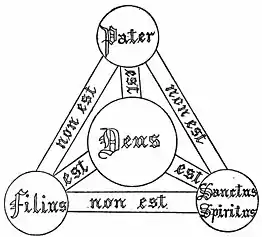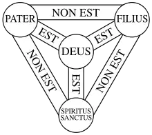 This diagram consists of four nodes (generally circular in shape) interconnected by six links. The three nodes at the edge of the diagram are labelled with the names of the three persons of the Trinity (traditionally the Latin-language names, or scribal abbreviations thereof): The Father ("PATER"), The Son ("FILIUS"), and The Holy Spirit ("SPIRITUS SANCTUS"). The node in the center of the diagram (within the triangle formed by the other three nodes) is labelled God (Latin "DEUS"), while the three links connecting the center node with the outer nodes are labelled "is" (Latin "EST"), and the three links connecting the outer nodes to each other are labelled "is not" (Latin "NON EST").
