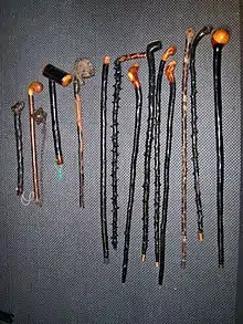 The loaded types needed to have its knob fitted with iron ferrules to maintain structural integrity.[17] But the sticks also have iron ferrules fitted onto their narrow end as well.[14][18][8] Shillelagh may also have a heavy knob for a handle which can be used for striking.[9] Shillelaghs may also have a strap attached, similar to commercially made walking sticks, to place around the holder's wrist.[19]