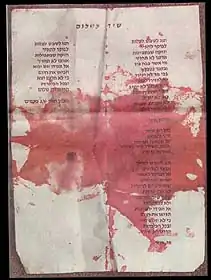 That line originally read שירו שיר לאהבה, ולא לניצחונות 'Sing a song to love and not to victories'. The original wording extolled peace and love over any tally of victories and conquests. Since the song was intended for a military ensemble, the head of the IDF education department at that time demanded that the line be removed. He argued that the performance of such a song by soldiers before an audience of other soldiers would be damaging to morale. In the end the IDF agreed to the replacement of the last word of the line, ניצחונות nitsakhonot 'victories' by מלחמות milkhamot 'wars', and the song was recorded and published in that revised form.[5][6]