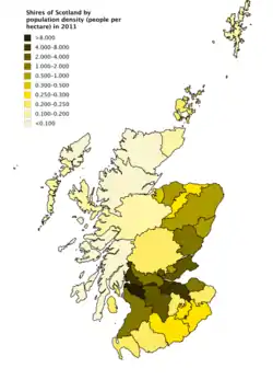 Shires of Scotland by population density (people per hectare) in 2011