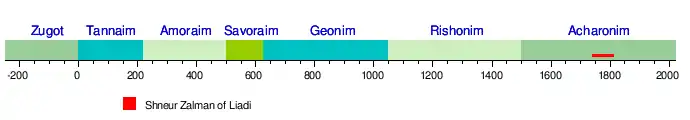 Shneur Zalman is well known for the Shulchan Aruch HaRav, a collection of authoritative codes of Jewish laws and customs commissioned by Dovber of Mezeritch and composed at the legendary age of twenty-one.[30] The Maggid of Mezeritch sought a new version of the classic Shulkhan Arukh for the Hasidic movement. The work states a selection of decided halakha, as well as the underlying reasoning, and common Hasidic customs. The Shulchan Aruch HaRav is considered authoritative by other Hasidim, and citations to this work are many times found in non-Hasidic sources such as the Mishnah Berurah used by Lithuanian Jews and the Ben Ish Chai used by Sephardic Jews. Shneur Zalman is also one of three halachic authorities on whom Shlomo Ganzfried based his Kitzur Shulkhan Arukh (Concise version of Jewish law).