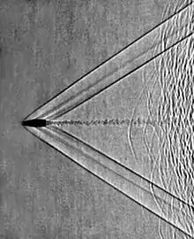 In physics, a shock wave (also spelled shockwave), or shock, is a type of propagating disturbance that moves faster than the local speed of sound in the medium. Like an ordinary wave, a shock wave carries energy and can propagate through a medium but is characterized by an abrupt, nearly discontinuous, change in pressure, temperature, and density of the medium.[1][2][3][4][5][6]