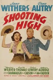 Shooting High is a 1940 American Western film directed by Alfred E. Green and starring Jane Withers, Gene Autry, and Marjorie Weaver. Written by Lou Breslow and Owen Francis, the film is about a generations-old feud between two families that is resurrected when the town banker tries to contrsuct a highway through the area bearing a monument to the frontiersman ancestor of one of the families.[2] Shooting High was Gene Autry's first film away from Republic Pictures, his first as a mere co-star, his first without the comic presence of Smiley Burnette since 1934, and his first playing a character other than himself.[3]