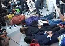 The protest regrouped downtown at the intersection of 14th and Broadway, blocking motor vehicle traffic.[63] Some of the protesters lay face down in the intersection, in a symbolic act of solidarity with Grant, who was killed in the same position.[61] Others shouted at police and chanted in unison. Others carried signs that read, "Your idea of justice?" and "Jail Killer Cops"[61] and lit candles in remembrance of Grant.