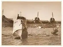 On 4 July 1936, the first of the Empire flying boats to be built, G-ADHL, named 'Canopus', conducted its maiden flight, flown by Shorts' chief test pilot, John Lankester Parker.[5] Early flights of the type were relatively trouble-free, Parker declaring his satisfaction with the aircraft's performance; the new styling of the planing bottom used also quickly proved its value.[5] On 17 September 1936, the first flight of G-ADHL on behalf of Imperial Airways occurred, flown by Major H G Brackley, Imperial Airways' Air Superintendent; the final delivery and proving flight of the aircraft to Marseilles, France took place on 22 October 1936.[6] The first series of the Short Empires, the S.23, could carry 5 crew, 17 passengers, and 4,480 lb (2,035 kg) of cargo at a maximum speed of 174 knots (320 km/h) and was powered by four 920 horsepower (690 kW) Bristol Pegasus Xc radial engines.[7]