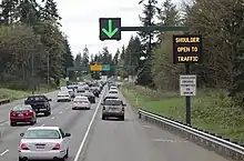In the United States, on specially signed sections of highway in the Boston metro area, cars are allowed to use the shoulder as they would a normal lane during morning and evening rush hours. The same scheme is employed elsewhere, such as on Interstate 580 in California on the Richmond-San Rafael Bridge, on Interstate 66 in Virginia between the Capital Beltway and US-50, and on Interstate 405 between SR 527 and I-5 in Bothell.[17]