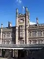 Shrewsbury railway station was originally built in October 1848 for the county's first railway — the Shrewsbury to Chester Line. The architect was Thomas Mainwaring Penson of Oswestry.[2] The building is unusual, in that the station was extended between 1899 and 1903 by the construction of a new floor underneath the original station building.[2] The building style was imitation Tudor, complete with carvings of Tudor style heads around the window frames. This was done to match the Tudor building of Shrewsbury School (now Shrewsbury Library) almost directly opposite. The station's platforms also extend over the River Severn. It was operated jointly by the Great Western Railway (GWR) and the London and North Western Railway (LNWR).[3]