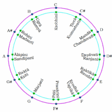 Some suggest that the best way to find the exact positions of shrutis is by analyzing the frequencies players use in actual performances.[23] This sounds simple, but runs the risk of giving multiple inaccurate values. In fact, when different artists performed raga Yaman on flute, sarangi, sitar, and voice, accuracy of pitch was found to be 'relative' and 'subjective',[27] and 'neither rigidly fixed','nor randomly varying'.[28] Further, the 'same Swara was pitched differently at different times by the same artiste in the same raga', and 'different artistes intoned the same swara differently in the same raga'.[29] Such an exercise is akin to estimating the centre of a large circlular lake by comparing intersections between ropes stretched across the surface; this gives a range of answers, and introduces difficulties in estimating accuracy. It is more practical to define the centre of a circle mathematically, and then compute the centre of the lake relative to points fixed in advance. Similarly, the values of 22 shrutis can be precisely calculated based on their natural relationships to the 22 Shruti-Mandal (Organogram) rather than an analysis of performances.