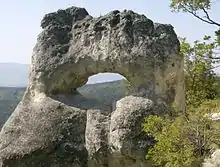 The Shumen Plateau Nature Park encloses the Bukaka Reserve Forest, which covers a total forest area of 63.04 hectares (155.8 acres). This forest is protected on account of its indigenous Fagus sylvatica (common beech) moesiaca (the Balkan beech) forest" that is several hundred years old. The only human activity allowed within this reserve is use of trails which pass through it.[1] The Shumen Plateau occupies the highest plateau in the Danubian Plain, with an elevation of 502 metres (1,647 ft), and features "bizarre and fantastic rock phenomena and underground Karst forms".[2][3]