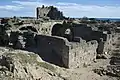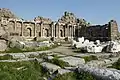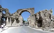 The well-preserved city walls provide an entrance to the site through the Hellenistic main gate (Megale Pyle) of the ancient city, although this gate from the 2nd century BC is badly damaged. Next comes the colonnaded street, whose marble columns are no longer extant; all that remains are a few broken stubs near the old Roman baths. The street leads to the public bath, restored as a museum displaying statues and sarcophagi from the Roman period. Next is the square agora with the remains of the round Tyche and Fortuna temple (2nd century BC), peripteral with twelve columns, in the middle. In later times it was used as a trading centre where pirates sold slaves. The remains of the theatre, which was used for gladiator fights and later as a church, and the monumental gate date back to the 2nd century. The early Roman Temple of Dionysus is near the theatre. The fountain gracing the entrance is restored. At the left side are the remains of a Byzantine Basilica. A public bath has also been restored.[3]