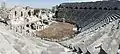 There are colossal ruins of a theatre complex, the largest in Pamphylia, built much like a Roman theatre that relies on arches to support the sheer verticals. The Roman style was adopted because Side lacked a convenient hillside that could be hollowed out in the usual Greek fashion more typical of Asia Minor. The theatre is less well-preserved than the theatre at Aspendos, but it is almost as large, seating 15,000–20,000 people. With time and the shifting of the earth, the scaena wall has collapsed over the stage and the proscenium is in a cataract of loose blocks. It was converted into an open-air sanctuary with two chapels during Byzantine times (5th or 6th century).