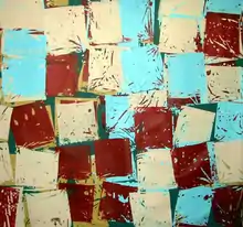 Tillim's representational art had developed in the socially and politically unstable sixties and seventies; while his experiments in abstract art occurred at the time conservatism took hold in the eighties and nineties. It was in 1987 that he accidentally kicked over a can of paint in his studio and proceeded to soak up the spill off the floor with a roll of paper towels. The saturated toweling inspired him to imprint the sheets directly onto the canvas. He had stumbled upon a process that made concrete his ideas about reproduction, repetition, fabrication, and postmodernist art.[19] The imprints are large and colorful, energetic and elegant[20]—qualities that had been held in check by the labor of history painting (which could take months and in one instance, Tillim admitted, took years[21]).