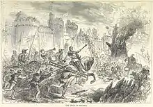 Following the decisive Scots victory at the Battle of Bannockburn in 1314, the Scots had recovered all their strongholds, with the exception of Berwick. In September 1317, King Robert Bruce attempted a siege of Berwick, which lasted until November before he withdrew.[1] The following April, an English sergeant was bribed to allow a party of Scots to climb the town wall. The raiding party, led by Sir James Douglas, and possibly the Earl of Dunbar, took the town after a fight. The castle was warned when they lost control of their men, who began to plunder and failed to capture the castle. King Robert soon arrived with an army, and after an eleven-week siege, the castle garrison capitulated due to a lack of supplies.[2] The English burgesses were expelled, and King Robert re-established Berwick as a Scottish trading port, installing his son-in-law Walter Stewart as Keeper.[2]
