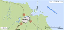 Caesar arrived at Brundisium on 9 March 49 BC with a total of 3 veteran legions (Legio VIII, Legio XII and Legio XIII) along with 3 freshly levied legions. Pompey remained within the city with the equivalent of 2 legions.[4] He had been overseeing a massive logistical operation which involved requisitioning merchant vessels so that the vast majority of his forces, and most of the prominent senators who had accompanied him, had already been transferred across the Adriatic to Epirus in Greece.[5] Unsure of whether Pompey intended to stay at Brundisium and retain a foothold in Italy, from which to better exert control over both the peninsula and the Adriatic, or whether he was simply waiting for the remainder of his men to be evacuated Caesar resolved to besiege the city and cut off Pompey's communication lines in the event that the former was true. His plan of action was to build two mounds of dirt on each side of the harbour outside the city, then across the expanse of water would be anchored a number of double-floats. These floats would be thirty feet wide and covered with dirt so as to make them more easily defensible. On every fourth float there was to be constructed a two-storey high defensive turret as well as at either end of the structure.[6]