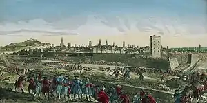 The Siege of Maastricht took place in April–May 1748 during the War of the Austrian Succession. A French force under the overall command of Maurice de Saxe besieged and captured the Dutch barrier fortress of Maastricht in the final few months of the campaign in the Low Countries. After a relatively long siege the garrison of Maastricht capitulated and marched out with the honours of war. Maastricht was returned along with France's conquests in the Austrian Netherlands according to the Treaty of Aix-la-Chapelle signed in 1748.