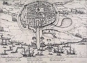 The waterways around the city were soon blocked, which soon caused supplies to run low for the Middelburg inhabitants.[6] The rebels included an English regiment under Thomas Morgan, a few Scots ensigns, and a number of untrained recruits from England.[5][7]