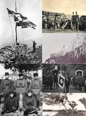 ![]() Clockwise from top left: Flags of Great Powers on Shkodër fortress; Ottoman troops defending Shkodër; Montenegrin flag flying over the Shkoder fortress; Captured flag standard of Montenegrin forces proudly displayed by Turkish and Albanian troops; Albanian guerillas shooting from a tree; Albanian officers posing with captured Montenegrin ammunition | |||||||