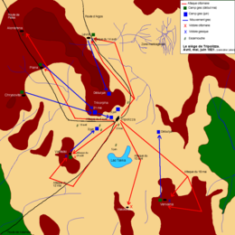 It was also a potent symbol for revenge, its Greek population having been massacred by the Ottoman forces in the past: the latest of such events, a few months earlier, following the failed rebellion at Moldavia in early 1821; previous massacres of the town's Greeks occurred in 1715 (during the Ottoman reconquest of the Morea) and on Holy Monday, 29 March 1770, after the failed Orlov Revolt.[11][12][13] The de facto commander in chief of the Greek forces, Theodoros Kolokotronis, now focused on the capital of the province. He set up fortified camps in the surrounding places, establishing several headquarters under the command of his captain Anagnostaras in the nearby villages, notably Zarachova, Piana, Dimitsana and Stemnitsa, where local peasants provided his men with food and supplies.[14]