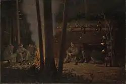 On April 4, 1862, the Union Army pushed through Magruder's initial line of defense but the following day encountered his more effective Warwick Line. The nature of the terrain made it difficult to determine the exact disposition of the Confederate forces. McClellan correctly estimated that the Confederates had 15-18,000 troops in the defensive line.[8] It has been claimed that Magruder attempted to deceive by moving infantry and artillery in a noisy, ostentatious manner to make the defenders seem a much larger forces than their actual numbers.[9] However, his reports do not mention this and no reference before 1988 can be found claiming this, except for Shelby Foote's three volume history of the Civil War, first published in 1956.[10] On 6–7 April McClellan correctly estimated (given Magruder's reinforcements) that 30,000 troops were at Yorktown.[11] Troops continued to arrive and on 20 April McClellan correctly estimated "more than 80,000" were at Yorktown.[12]