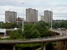 The fate of the five remaining Pinkston blocks was debated further. After a campaign by local residents, at least two of the blocks were to be retained and refurbished by Glasgow Housing Association, with three being demolished or sold to private developers.[9][10] However, Glasgow then bid for the 2018 Youth Olympics and were added to the hosting shortlist, but the successful city had to have its Athletes Village prepared – this resulted in the total demolition of Sighthill's towers to accommodate a new low-rise revelopment.[11] The bid was lost, but regeneration continued. The Sighthill 'Transformational Regeneration Area' includes a new school campus, landscaped green areas, enhanced pedestrian bridge to the city centre and better connectivity to the Forth and Clyde Canal,[12][13][14] in addition to approximately 1,000 new housing units for sale, private rental and social rental (much of it marketed as 'NorthBridge' by developers Keepmoat).[15][16]