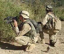 By 1990, most Army units had replaced their older VRC-12 series FM radios for the new SINCGARS ("SINgle-Channel Ground-Air Radio Systems") family of equipment. Rather than sending a signal along one signal frequency, the SINCGARS radios sent its signals across many frequencies, "hopping" from one frequency to another at high speed. This allowed many nets to share an already-crowded frequency spectrum.[19] Later generations of these radios combined the communications security (COMSEC) encryption devices with the receiver/transmitter, making a single easier-to-program unit. Most significant, the SINCGARS radios could send and receive digital traffic with great fidelity.[20] By the advent of Operation Desert Shield, all Army units were deployed using the most secure FM communications in the world. The SINCGARS radios have a failure rate in extreme heat of once every 7,000 hours compared to the VRC-12 series' failure rate of 2–300 hours.[21]