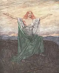 The compound sigr-drífa means "driver to victory"[2] (or "victory-urger", "inciter to victory"[3]) It occurs only in Fafnismal (stanza 44) and in stanza 4 of the Sigrdrifumal. In Fafnismal, it could be a common noun, a synonym of valkyrie, while in Sigrdrifumal it is explicitly used as the name of the valkyrie whose name is given as Hildr or Brynhildr in the Prose Edda.[2] Bellows (1936) emphasizes that sigrdrifa is an epithet of Brynhildr (and not a "second Valkyrie").[4]