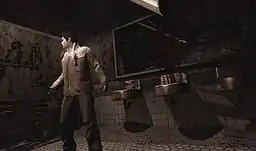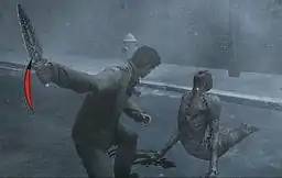 In addition to exploration, combat is another major element to the gameplay, and the player must fight the various monsters that appear. In contrast to the more naïve everyman protagonists of previous games, combat in Homecoming takes into account Alex's experience as a soldier.[8] The player is able to perform light and heavy attacks, or mix them to perform combinations,[11] and may also perform a variety of finishing moves to ensure that the monsters are dead, a gameplay mechanic first featured in a rudimentary form in Silent Hill: Origins.[11] Attacking enemies also leaves wounds in them that match the motion carried out by Alex in inflicting the attack.[12] In terms of controlling Alex, the player may also perform new maneuvers such as targeting the enemy before attacking them, dodging enemy attacks, and performing counter-attacks.[9] As well as melee weapons, pistols, rifles and shotguns are available as firearms, which can be upgraded to stronger versions later in the game: firearm handling is also rendered in a more realistic manner, with Alex having to shoulder long guns and suffering aim effects like recoil.[10] In addition to the changes in combat, and unlike previous entries in the series, the player is also able to fully control and rotate the camera as they choose;[8] one analog stick controls player movement, and the other controls the camera.