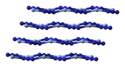 X-ray crystallography shows that AgN3 is a coordination polymer with square planar Ag+ coordinated by four azide ligands. Correspondingly, each end of each azide ligand is connected to a pair of Ag+ centers. The structure consists of two-dimensional AgN3 layers stacked one on top of the other, with weaker Ag–N bonds between layers. The coordination of Ag+ can alternatively be described as highly distorted 4 + 2 octahedral, the two more distant nitrogen atoms being part of the layers above and below.[3]