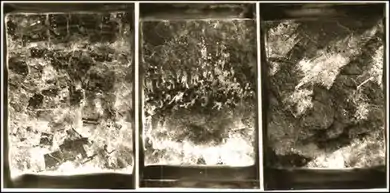Critics suggest that Malagrino's early black-and-white photographic work served as a springboard for poetic expression in the realm of memory and dreams.[18][19][21][22] She blended smaller units to produce large works centered on the body and psyche, nature and the primordial, often obliterating the original imagery to create what critic David McCracken called, a "neat, new balance of barely suggested figures and images in a depthless field of murky abstraction."[18][23] Writer Judith Russi Kirshner described this work, in Malagrino's "Earth Calls" exhibition (1993), as a "rich array of textures, layered imagery and […] an uncertain imaginative terrain" that built "aesthetic connections to the forces and energies of survival."[22][13][15] Her 1992 "Habitat" series (see above) used these strategies to reflect on issues of power and dominance relating to the land and individuals through images that suggested aerial mappings and spiritual figures of tribal cultures.[23][24][25]