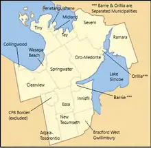 The cities of Barrie and Orillia, although separate politically and administratively from the County, are geographically and economically part of the County and send elected representatives to serve on County committees which provide services to the residents of the cities, including paramedic services, long term care facilities, social services, social housing, archives and Museum. They are counted within the census division.