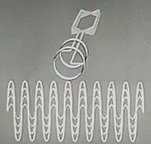 This design also allows us to increase the output voltage by modifying the shape of the armature. We can add more rectangular loops to the armature as seen on the picture on the right. The additional loops at the armature arm are connected in series, which are actually additional windings of the same conductor wire to form a coil in rectangular shape. In this example, there are 4 windings in the coil. Since the shapes of all windings are the same, the amount of the lines of force will be cut at the same amount in the same direction at the same time in all windings. This creates in phase AC output for these 4 windings. As a result, the output voltage is increased 4 time as shown in the sine wave in the diagram.[4]