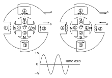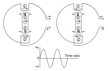 The design of revolving field generators is to have the armature part on stator and the magnetic field part on rotor. A basic design of revolving field single-phase generator is shown on the right. There are two magnetic poles, north and south, attached to a rotor and two coils which are connected in series and equally spaced on stator. The windings of the two coils are in reverse direction to have the current to flow in the same direction because the two coils always interact with opposing polarities. Since poles and coils are equally spaced and the locations of the poles match to the locations of the coils, the magnetic lines of force are cut at the same amount at any degree of the rotor. As a result, the voltages induced to all windings have the same value at any given time. The voltages from both coils are "in phase" to each other. Therefore, the total output voltage is two times the voltage induced in each winding. In the figure, at the position where pole number 1 and coil number 1 meet, the generator produces the highest output voltage on one direction. As the rotor turns 180 degrees, the output voltage is alternated to produce the highest voltage on the other direction.[3] The frequency of the AC output in this case equals to the number of rotations of the rotor per second.