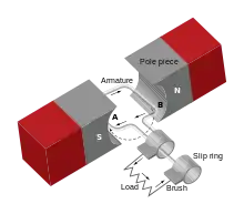 The design of revolving armature generators is to have the armature part on a rotor and the magnetic field part on stator. A basic design, called elementary generator,[3] is to have a rectangular loop armature to cut the lines of force between the north and south poles. By cutting lines of force through rotation, it produces electric current. The current is sent out of the generator unit through two sets of slip rings and brushes, one of which is used for each end of the armature. In this two-pole design, as the armature rotates one revolution, it generates one cycle of single phase alternating current (AC). To generate an AC output, the armature is rotated at a constant speed having the number of rotations per second to match the desired frequency (in hertz) of the AC output.