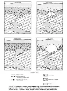 The formation of sinkholes involves natural processes of erosion[9] or gradual removal of slightly soluble bedrock (such as limestone) by percolating water, the collapse of a cave roof, or a lowering of the water table.[10] Sinkholes often form through the process of suffosion.[11] For example, groundwater may dissolve the carbonate cement holding the sandstone particles together and then carry away the lax particles, gradually forming a void.