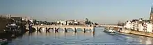 The bridge is made of limestone, and in its current configuration it is 160 metres (525 ft) long and 9 metres (30 ft) wide. Its seven arches each span approximately 12 metres (39 ft), and are supported by seven piers.[3][4][5] A separate steel drawbridge with a span of 54.5 metres (178 ft 10 in) connects the east end of the bridge to the east bank of the river.[6]
