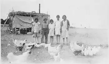 During the fur trade era, the thiyóšpaye refused to trade only for economic reasons. Instead the production and trade of goods was regulated by rules of kinship bonds.[13] Personal relationships were pivotal for success: in order for European-Americans to trade with the Očhéthi Šakówiŋ, social bonds had to be created.[13] The most successful fur traders would marry into the kinship society, which also raised the status of the family of the woman through access to European goods.[14] Outsiders are also adopted into the kinship through the religious Huŋkalowaŋpi ceremony. Early European explorers and missionaries who lived among the Dakota were sometimes adopted into the thiyóšpaye (known as "huŋka relatives"), such as Louis Hennepin who noted, "this help’d me to gain credit among these people".[15] During the later reservation era, districts were often settled by clusters of families from the same thiyóšpaye.[16]