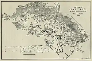 Promoted to lieutenant-general on 1 October 1877,[9] Stewart commanded the Quetta Army during the Second Anglo-Afghan War advancing through the Bolan Pass to Quetta, and then on to Kandahar in January 1879.[8] In March 1880, he made a difficult march from Kandahar to Kabul, fighting on the way the Battle of Ahmed Khel and Battle of Arzu, and then holding supreme military and civil command in northern Afghanistan.[8] On hearing of the Maiwand disaster, he despatched Sir Frederick Roberts with a division on his celebrated march from Kabul to Kandahar, while he led the rest of the army back to India through the Khyber Pass.[1][8] For this he was given the thanks of parliament and created a baronet.[1][10]