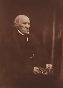 Gladstone was also interested in politics. At first he had been a Whig, but from 1812 onwards his political outlook appears to have changed due to a number of factors. In religion he had long ceased to have any sympathy with Unitarianism or Presbyterianism. He had become alienated from the Whig and Radical circles in Liverpool, and feared the disorder caused by the Napoleonic Wars.[23] The friendships he formed with Tories George Canning and Kirkman Finlay also had a great influence on his changing political outlook, and he became a Tory. In 1812 he presided over a meeting at Liverpool which was called to invite George Canning to represent Liverpool in the House of Commons.[24]