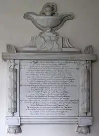 A marble mural monument in his memory exists in Shute Church, signed "P.Rouw sculp. London", by Peter Rouw. It consists of an inscribed tablet flanked on either side by a fasces supporting an entablature on top of which, above his coat of arms, is a classical oil-lamp with flame: