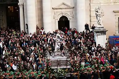 Every year, on December 13, the city of Siracusa celebrates the festival of its patron saint, Santa Lucia, with a long procession from the Piazza del Duomo in Ortigia to the Chiesa di Santa Lucia al Sepolcro. Eight days later, on the December 20, the procession retraces its route. On December 13, tradition dictates that the large candles which stand at the four corners of the statue of Santa Lucia are covered with bouquets of flowers, while on December 20, the silver statue is flanked by candles adorned with lemons and oranges.