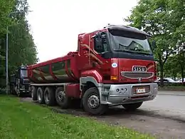 In 1949 SAT made a return to lorry production with the Sisu K-23.[23] The first heavy forward control lorries were the 1956 produced B-56 and 1958 introduced B-72, both of them being built on bus chassis.[24] The small forward control lorry Nalle-Sisu KB-24 came to market in 1955.[25] Other notable models introduced in the 1950s are the heavy dumper trucks K-36,[26] the first 6×4 driven Sisu, K-32,[27] and K-44 with a North European specialty, 4×4+2 layout.[28]